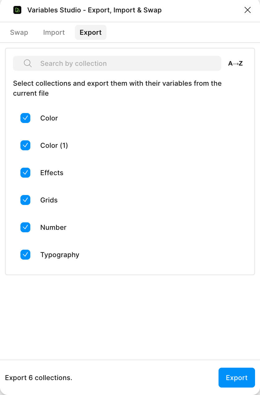 Launch Variables Studio and navigate to the Export tab. You'll see a list of all variable collections in your file.