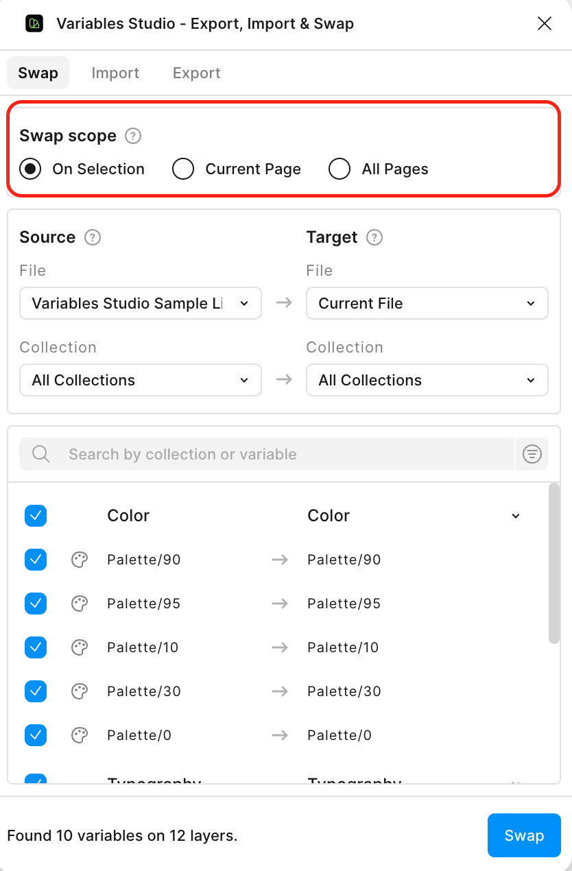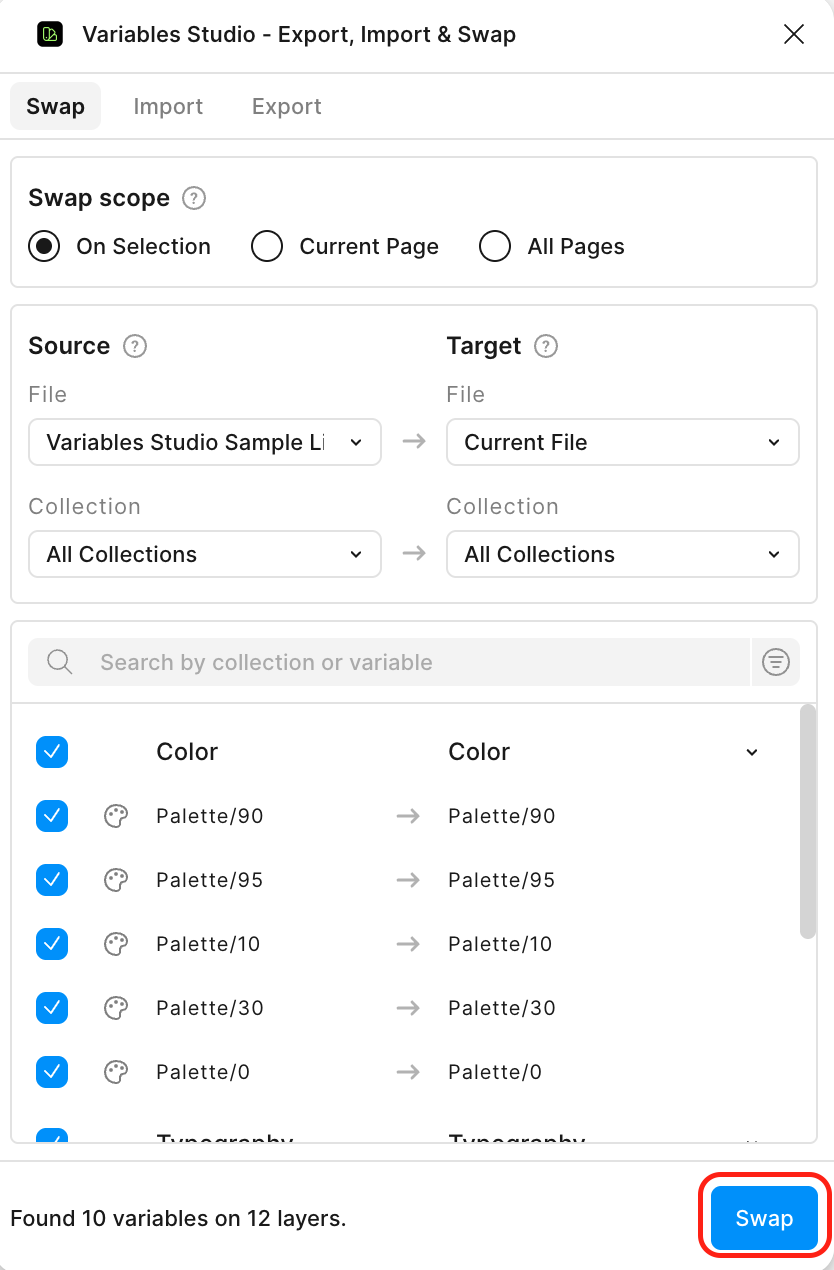 Check the preview to ensure the swap will affect the correct layers and variables.